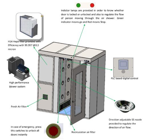 Two door/ 3 doors showers with different Entry/ Exit arrangements | Air shower without doors | Air shower without floor | Solid/ grated floor | Air shower tunnel | Differential Pressure gauge | Inclined Tube Manometer | Doors with Floor Spring | Electronic Air Ionizer | Emergency light | Digital Timer |