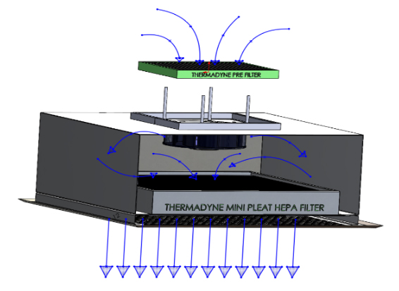 - A motorized fan is used to pull air through the pre filter and push through hepa filter for distribution to rooms or enclosed work stations such as assembly tables.